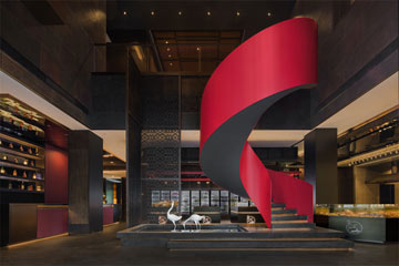 山居榮府中餐廳設(shè)計(jì)以富春江白鷺為題,借富春江兩岸初秋景色為依托,從店面的LOGO形象到軟裝陳設(shè),都由此統(tǒng)一展開(kāi)。進(jìn)入門(mén)廳區(qū)域,是一副白鷺?biāo)畱驁D,旁邊旋轉(zhuǎn)而上的中國(guó)紅樓梯,是整個(gè)空間一大亮點(diǎn)。逶迤蜿蜒的造型,連接多元空間的同時(shí),也是冷靜素雅的直線(xiàn)條里穿插的超級(jí)印象符號(hào)。兩側(cè)是吧臺(tái)與明廚分廳而立。右手邊通透簡(jiǎn)明的明廚,模糊......
